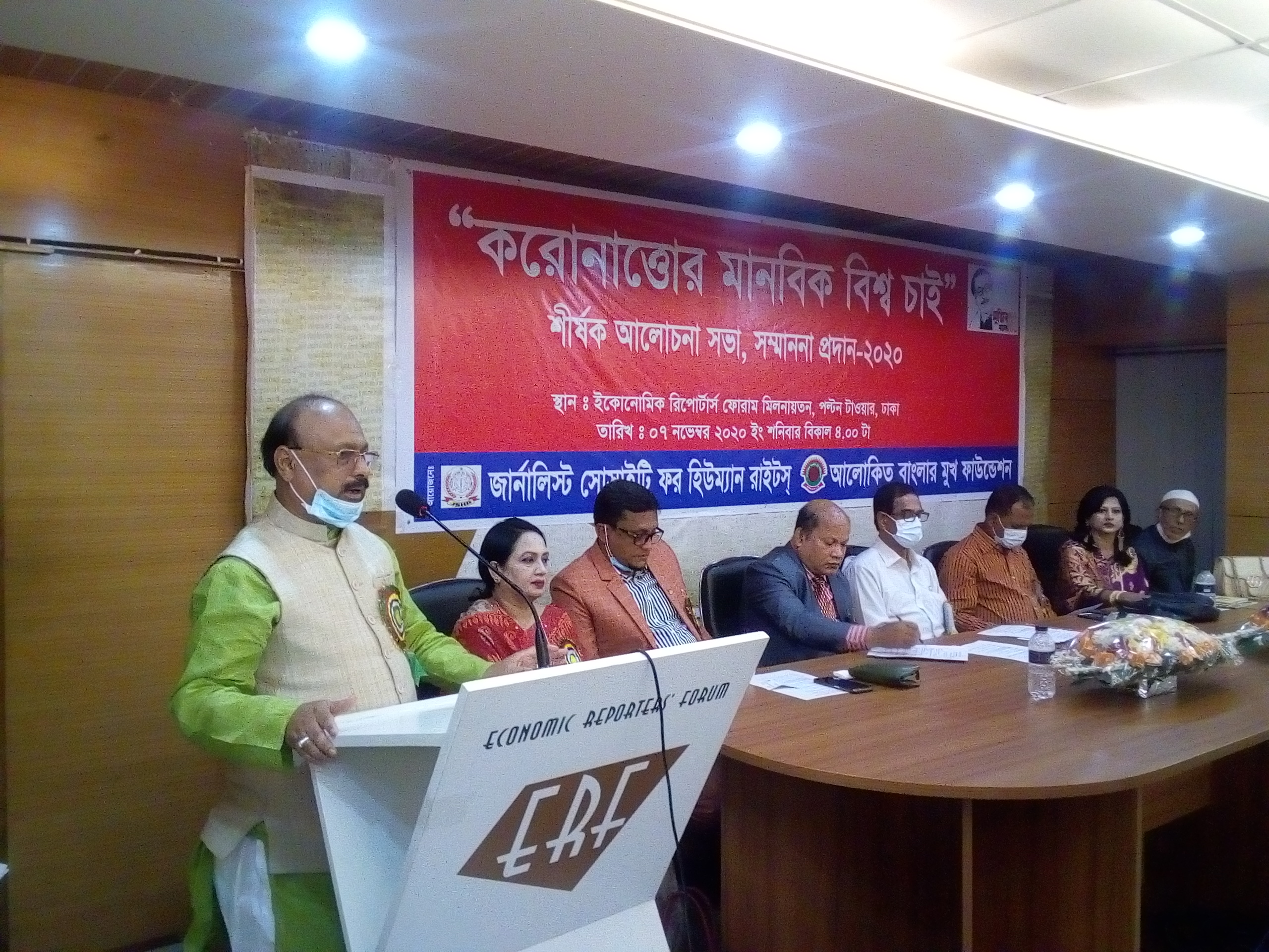 আব্দুর রশিদ, নীলফামারী ঃ করোনাত্তর ও মানবিক বিশ^ চাই এই প্রতিপাদ্যকে সামনে রেখে জার্নালিস্ট সোসাইটি হিউমান রাইটস ও আলোকিত বাংলার মুখ ফাউন্ডেশনের আয়োজনে ইকোনমিক রির্পোর্টাস ফোরাম মিলনায়তনে নীলফামারীর কৃতি সন্তানকে মাদার তেরেসা সম্মাননা প্রদান করা হয়েছে। সম্মাননা পেয়েছেন নীলফামারী জেলা তাঁতীলীগের সংগ্রামী সভাপতি বিশিষ্ট রাজনৈতিক ব্যাক্তিত্ব দেওয়ান সেলিম আহমেদ । র্জানালিস্ট সোসাইটি হিউম্যান রাইটসের চেয়ারম্যান এডভোকেট মোঃ মনির হোসেনের সভাপতিত্বে প্রধান অতিথি হিসেবে ্উপস্থিত ছিলেন শেরেবাংলা কৃষি বিশ^বিদ্যালয়ের সাবেক ভাইস চেন্সেলর প্রফেসর মোঃ কামাল উদ্দিন আহমেদ। এসময় প্রধান আলোচক হিসেবে উপস্থিত ছিলেন আই এন বি সংবাদ সংস্থার চেয়ারম্যান ব্যারিস্টার জাকির আহমেদ। বক্তব্য রাখেন শাহ আলম চুন্ন চেয়ারম্যান আলোকিত বাংলার মুখ ফাউন্ডেশন.মোঃ আতাউল্লাহ খান সভাপতি ভোক্তা অধিকার আন্দোলন,মির্জা শরিফুল আলম সাবেক উপকরকমিশনার ও বিশিষ্ট রাজনৈতিক ব্যক্তিত্ব,কবী আইরিন খান লেখক ও আওয়ামীলীগ নেত্রী দেওয়ান সেলিম আহমেদ সভাপতি জেলা তাঁতীলীগ নীলফামারী প্রমুখ। দেওয়ান সেলিম আহমেদ তার বক্তব্যে বলেন মাননীয় প্রধান মন্ত্রী জননেত্রী শেখহাসিনা ও নীলফামারী পৌর মেয়র ও জেলা আওয়ামীলীগের সংগ্রামী সভাপতি দেওয়ান কামাল আহমেদের নির্দেশনা অনুযায়ী করনাকালীন সময়ে জীবনের ঝুকি নিয়ে গরীব ও দুস্থ মানুষের পাশে দাড়িয়েছি এবং ভবিষ্যতে উনারা যে নির্দেশনা দিবেন তা অক্ষরে অক্ষরে পালন করব নীলফামারীর জেলা তাঁতীলীগ যে কোন সংকটময় মুর্হুতে অসহায় মানুষের পাশে থাকবে। অনুষ্ঠানটি সঞ্চালনা করেন এম এইচ আরমান চোধুরী মহাসচিব র্জানালিস্ট সোসাইটি হিউম্যান রাইটস।
