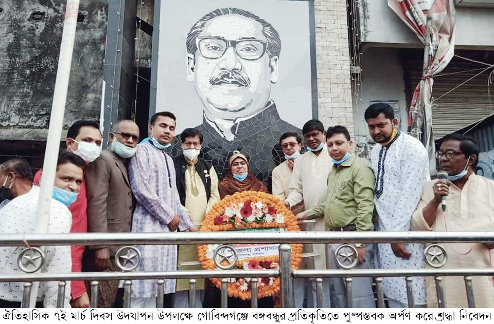 ঐতিহাসিক ৭ই মার্চ দিবসের ভাষণ উপলক্ষে গাইবান্ধার গোবিন্দগঞ্জে উপজেলা আওয়ামী লীগ দলীয় কার্যালয়ের সমনে জাতির পিতা বঙ্গবন্ধু শেখ মুজিবুর রহমানের প্রতিকৃতিতে পুষ্প¯ত্মবক অর্পণ করে শ্রদ্ধা নিবেদন করা হয়েছে। সকালে