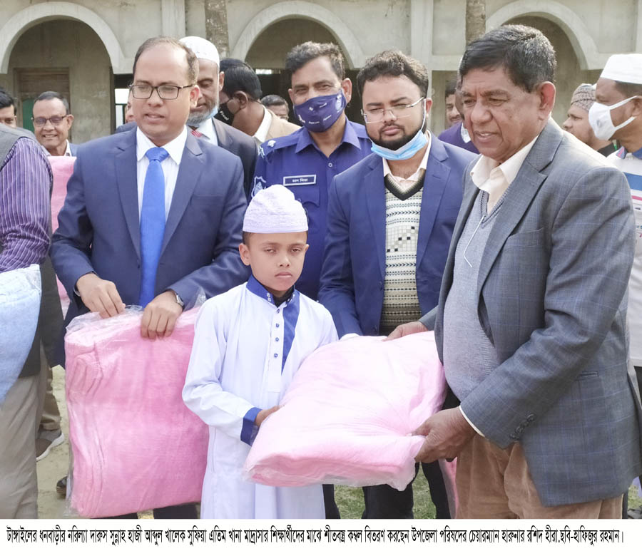 টাঙ্গাইলের ধনবাড়ীর ধোপাখালী ইউনিয়নের নরিল্যা দারুস সুন্নাহ হাজী আব্দুল খালেক সুফিয়া এতিম খানা মাদ্রাসার ২১০ জন শিক্ষার্থীর মাঝে দুর্যোগ ব্যবস্থাপনা অধিদপ্তর, উপজেলা প্রশাসন ও পরিসদের পক্ষ থেকে শীতবস্ত্র কম্বল বিতরণ করা হয়েছে।